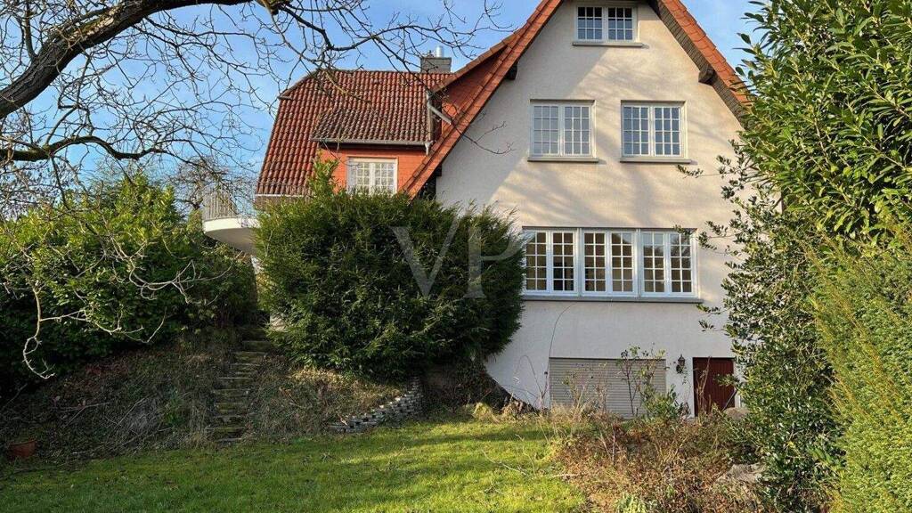 Das freistehende Einfamilienhaus liegt in einem schönen Garten, ist wenig einsehbar und verfügt über eine Garage sowie zwei Stellplätze davor. Die 1984 erbaute Architektenvilla ist massiv gebaut. Natursteinböden und Parkett, Holzsprossenfenster und ein gemütlicher Kamin, der mit Holz befeuert wird, sorgen für ein gehobenes Ambiente. Viele teils bodentiefe Fenster lassen die Wohnräume hell und freundlich wirken.