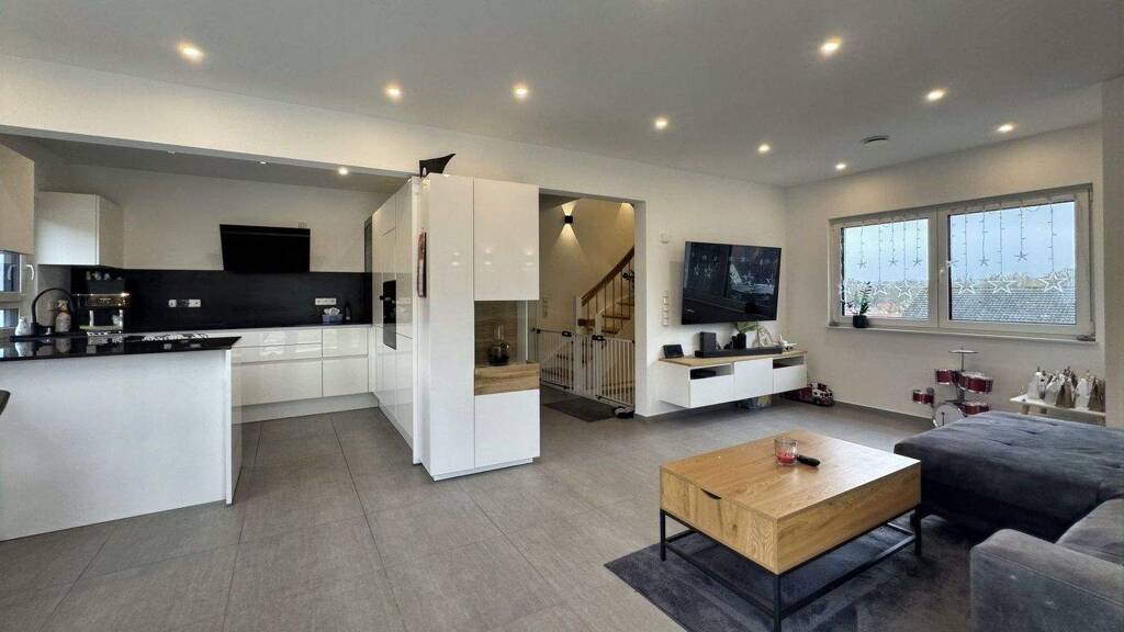 Die untere Ebene verfügt über einen großen Kellerraum, einen Hauswirtschaftsbereich mit Technikraum sowie einen zusätzlichen Wohnraum, der sich ideal als Büro, Gästezimmer oder Hobbyraum nutzen lässt. Damit bietet das Untergeschoss wertvolle Erweiterungsmöglichkeiten für unterschiedliche Lebenssituationen. Insgesamt verbindet diese Immobilie moderne Architektur, hochwertige Ausstattung und eine familienfreundliche Raumaufteilung.