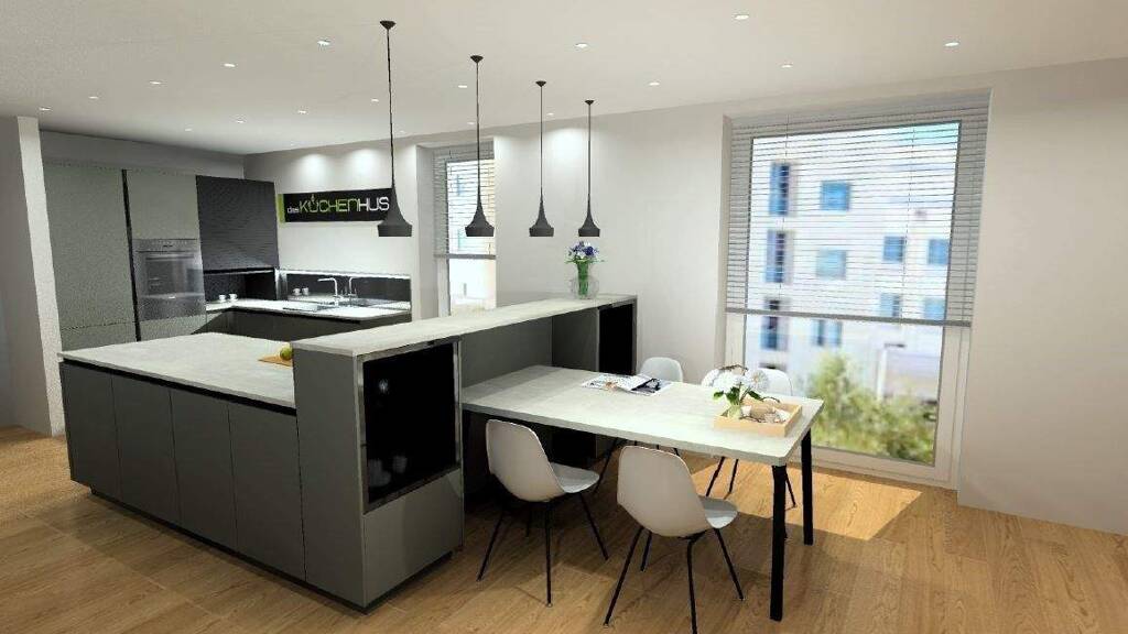 Herzstück der Wohnung ist der großzügige Wohn- und Essbereich mit offener Küche, der durch seine Helligkeit und Weitläufigkeit begeistert. Die Einbauküche mit integriertem Esstisch überzeugt durch ihr modernes, zeitloses Design. Sie fügt sich harmonisch in das Gesamtbild ein und bietet sowohl funktionalen Komfort als auch hochwertige Optik. Die Einbauküche ist mit Bosch-Markengeräten ausgestattet und lässt keinerlei Wünsche offen.