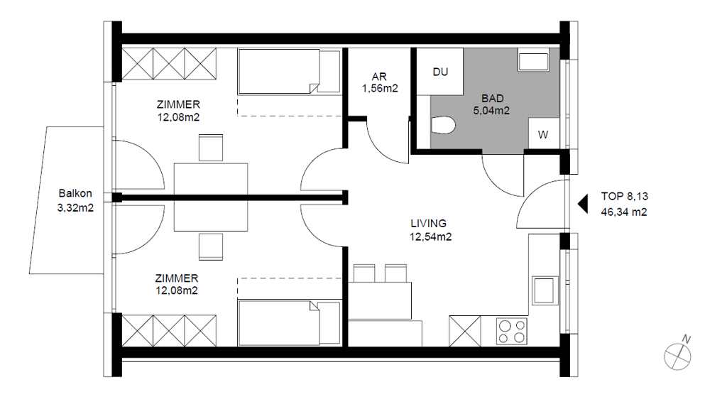 Auf ca. 46 m² Wohnfläche bietet die Wohnung ein Wohn-/Esszimmer mit moderner Einbauküche, die harmonisch in den Wohnbereich integriert ist, zwei gut geschnittene Schlafzimmer mit jeweils direktem Zugang zum Balkon, ein modernes Badezimmer mit Dusche sowie ein separates WC.