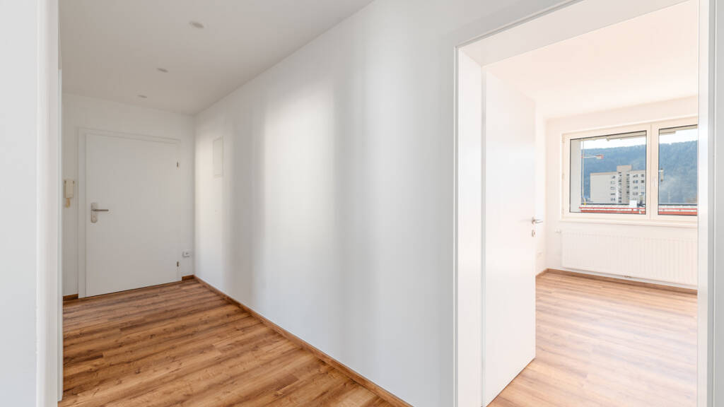 Die im zweiten Stock gelegene Wohnung wird zentral über einen Vorraum betreten. Das großzügige Wohn- Esszimmer ist hell, luftig und verfügt über einen Zugang zur einladenden nach Süden ausgerichteten Loggia. Die neue Küche inklusive Elektro-Geräte ist modern ausgestattet und lässt keine Wünsche offen. Natürlich sollte man auch die beiden Schlafzimmer, die kuschelig und gemütlich eingerichtet werden können, nicht außer Acht lassen. Im Vorraum, Wohn- Esszimmer, den beiden Schlafzimmern und der Küche, wurde strapazierfähiger Vinylboden verlegt. Ebenso wurden im Badezimmer moderne Boden- und Wandfliesen verbaut.