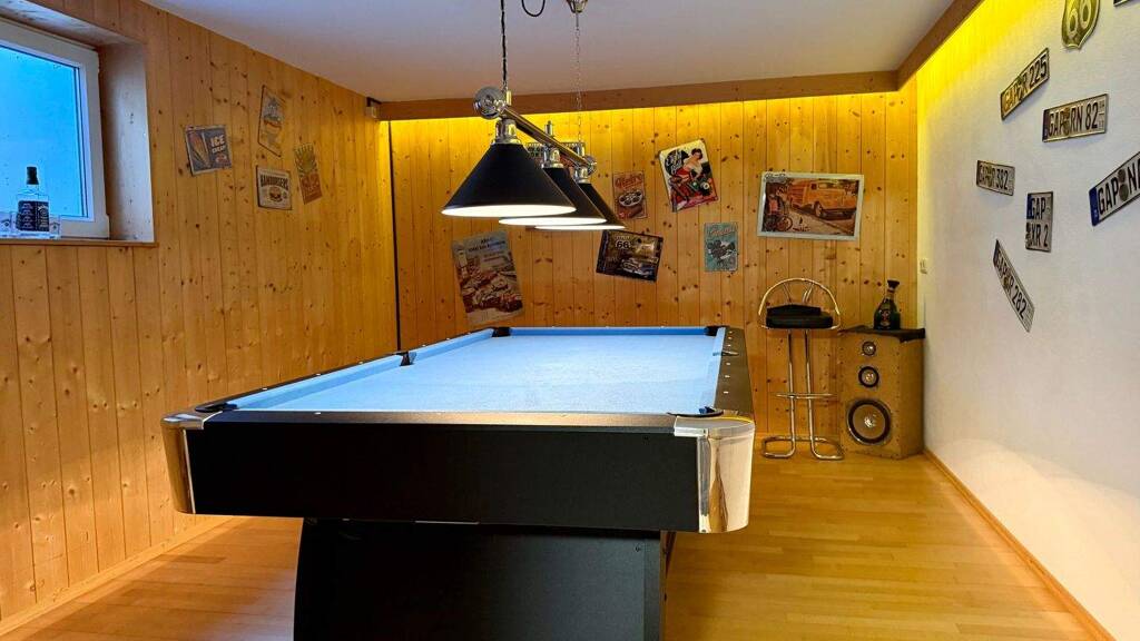 Das Haus ist vollständig unterkellert und bietet im Untergeschoss neben der Haustechnik umfangreiche Abstellmöglichkeiten. Im Waschraum sind zusätzlich eine Dusche und ein WC untergebracht. Besonders hervorzuheben sind die beiden großzügigen Hobbyräume im Untergeschoss, die derzeit als Bar- und Billardraum genutzt werden.