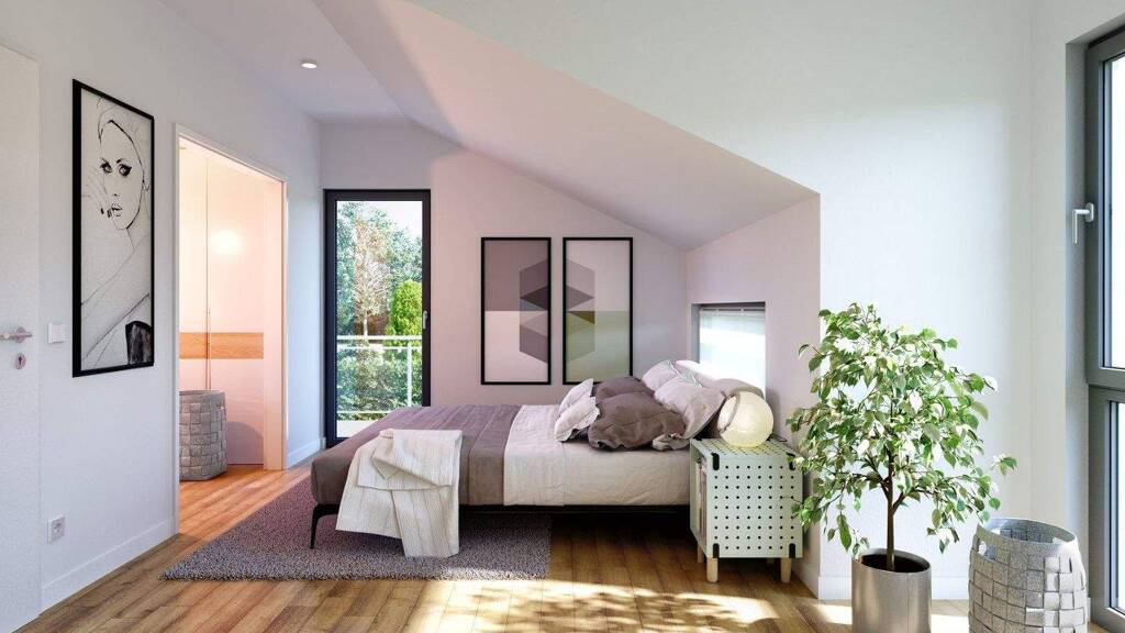 Das Dachgeschoss bietet erstaunlich viel Raum und Luxus. Der Elternbereich besteht aus einem geräumigen Schlafzimmer, eine angrenzende Ankleide, und wird vom eigenen Badezimmer mit Badewanne und bodenebener Dusche vervollständigt.