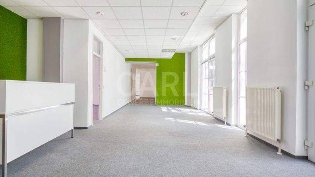 Die abgehängte Rasterdecke trägt zur Flexibilität dieser Mietfläche bei. Grundsätzlich kann eine Anpassung des Grundrisses nach Abstimmung mit dem Vermieter vorgenommen werden.