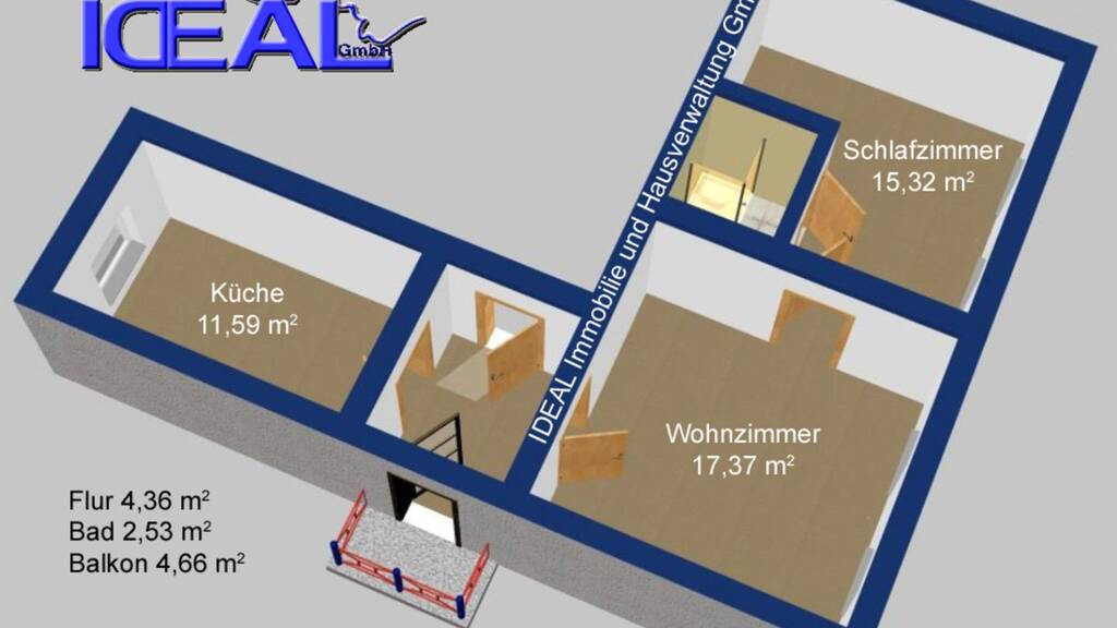- Aufteilung der Wohnung: Wohnen, Schlafen, Küche, Bad, Flur, Balkon und Gäste-WC