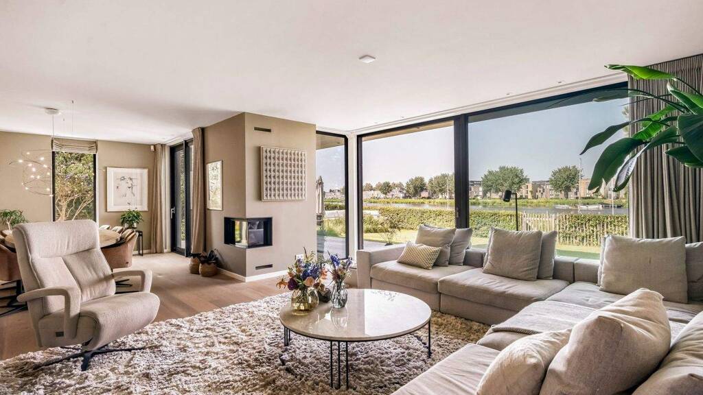 from the spacious hall with high ceilings, you enter the generous living area with large glass windows that immediately offer a beautiful view. the space has an impressive ceiling height and a cozy fireplace. various sliding doors lead to the carefully landscaped garden with its own dock on the water. the garden features a large hardwood terrace, lawn and green borders.