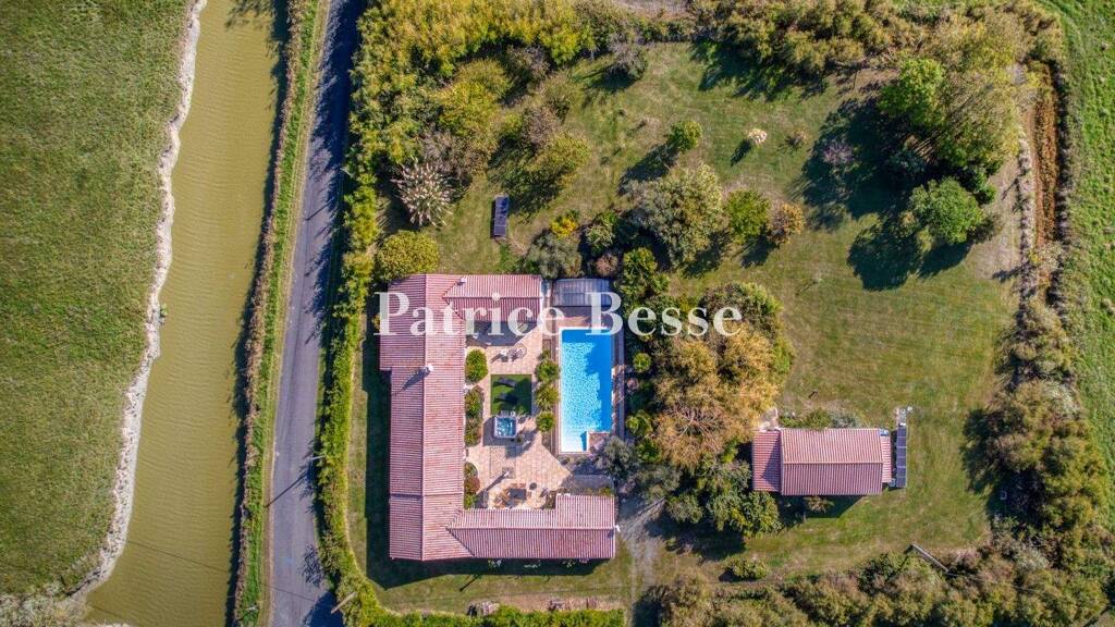 Surrounded by canals, both large and small, water is used as a natural property line to the south, while hedgerows of tamarisk line either side of the small access lane, which leads to a double gate framed by white pillars. The latter opens on to a grassy drive that eventually leads to the house of 232 m², after passing, on one side, a separate cottage of around 32 m², which abuts a garage of approximately 33 m².