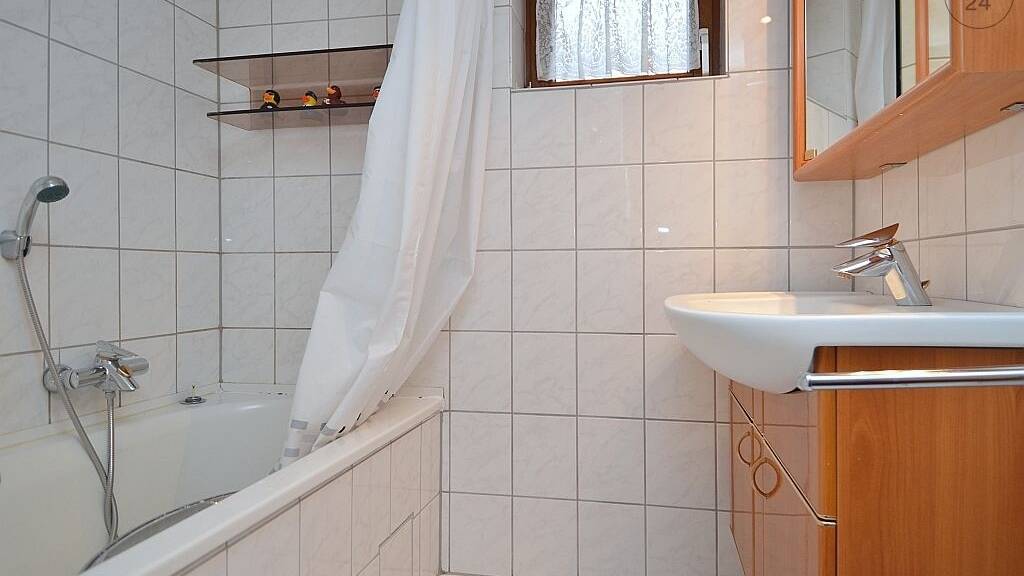 Das Badezimmer mit Badewanne und Tageslicht sowie ein separates Gäste-WC wird mit einem weiteren Bewohner gemeinschaftlich genutzt.