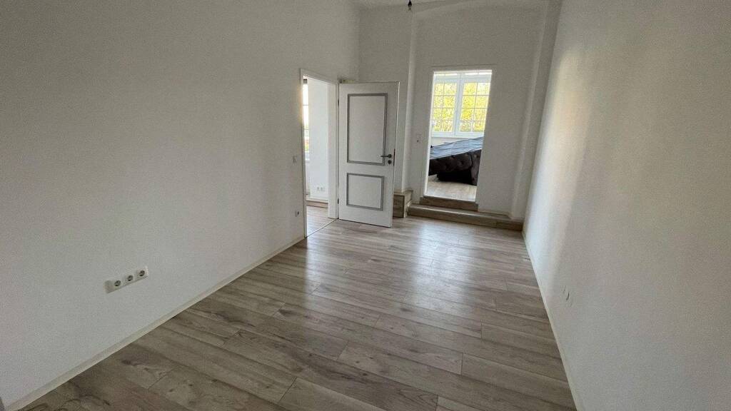 Über den Eingang vom Hof gelangen Sie in den Vorraum, wo ausreichend Platz für eine Garderobe ist. Durch die Glastür kommen Sie in den geräumigen Küchen- und Essbereich mit moderner und nur ein Jahr alter Einbauküche. Die Wohnung verfügt über drei Schlafzimmer, welche vom Flur aus begehbar sind. Vom Wohnzimmer mit Erker führt eine Treppe auf die zur Wohnung zugehörige eingezeunte Terrasse. Es gibt ein Gästebad mit WC und Waschtisch und ein neues Vollbad mit Badewanne, Dusche sowie Waschtisch. Die Fußböden in den Wohnräumen sind mit hellem, freundlichen Laminat verlegt. Küche und Bäder sind mit zeitlosen grauen Fliesen ausgestattet.
