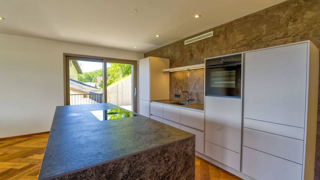 Das stilvolle Apartment, das sich in der zweiten Etage befindet, besticht durch seine hochwertigen Mafi Fischgrät Holzböden und maßgeschneiderte Tischlereinbauten. Die moderne Designer-Küche ist ein weiteres Highlight dieser Wohnung und lädt zum Kochen und Verweilen ein.