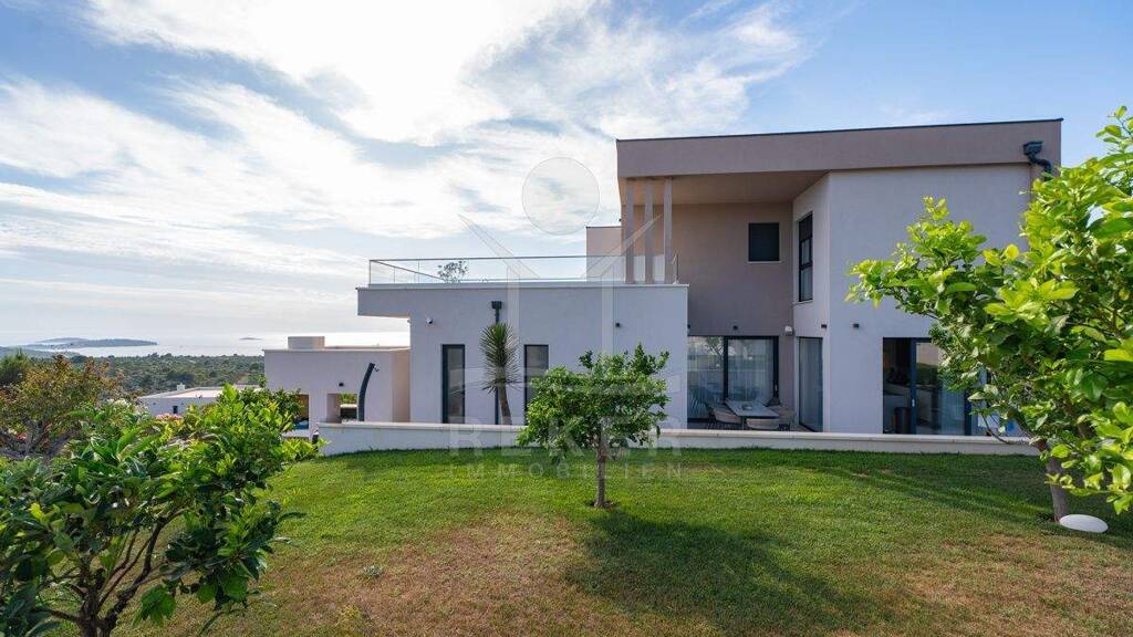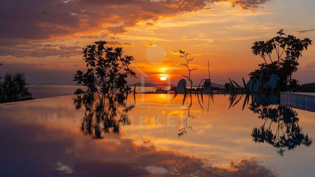 In ruhiger, grüner Hanglage von Primosten in Dalmatien erwartet Sie diese moderne Luxusvilla mit unverbaubarem Panorama-Meerblick und freier Sicht auf die charmante Altstadt. Das Meer erreichen Sie nach etwa 1,5 km, Bars und Einkaufsmöglichkeiten schon nach rund 300 Metern. Die erhöhte Position sichert Ihnen dauerhaft freie Aussicht und angenehme Privatsphäre. Für Ihre Fahrzeuge stehen eine Garage, eine Einfahrt mit Stellplatz sowie zwei weitere Parkplätze im umzäunten Grundstück bereit.