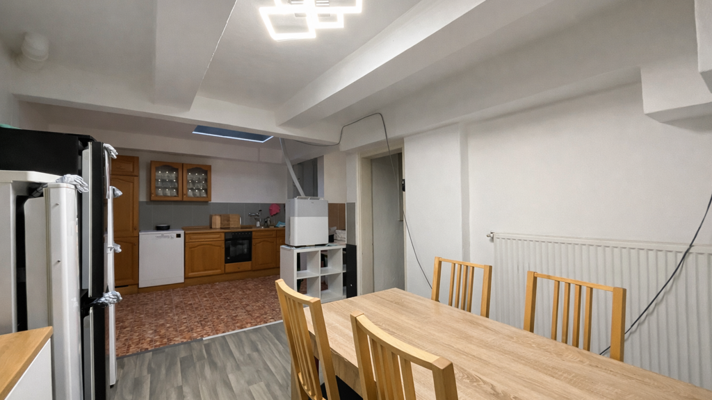 Über den Haupteingang erreicht man das Erdgeschoss, das aktuell sechs vermietbare Zimmer umfasst. Darüber hinaus befinden sich auf dieser Ebene eine Gemeinschaftsküche, sanitäre Anlagen mit WC und Duschen sowie ein Waschraum mit Waschmaschinen. Die Räumlichkeiten entstanden durch den Umbau eines früheren Tanzsaals und zeichnen sich durch ein großzügiges Raumgefühl aus.
