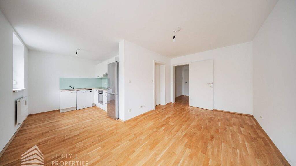 Die Immobilie befindet sich im EG eines fünfstöckigen Gebäudes und hat ca. 45,18 m². Sie betreten die Wohnung durch einen Vorraum. Unmittelbar auf der rechten Seite finden Sie das Badezimmer, in welchem sich eine Dusche und eine Toilette befindet. Etwas weiter, ebenfalls auf der rechten Seite, führt eine Tür in das ca. 9,70 m² große Schlafzimmer. Gegenüberliegend finden Sie den Abstellraum, welcher über einen Waschmaschinenanschluss verfügt. Geradeaus führt eine Glastür in die Wohnküche. Diese hat eine Größe von ca. 23,95 m² und verfügt über einen Zugang zu dem ca. 7,60 m² großen Balkon.
