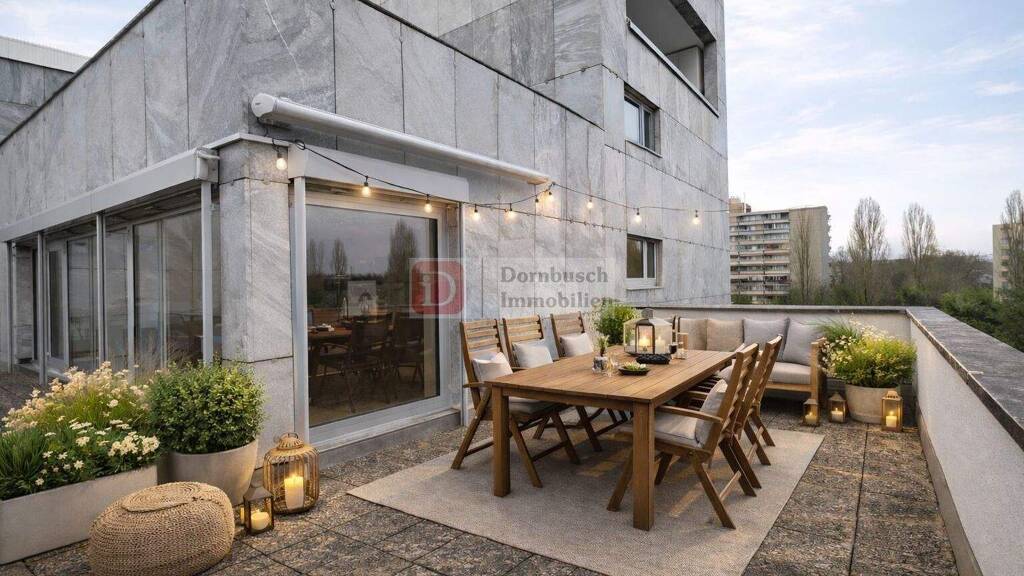 Skylineblick bei Tag. Lichtermeer bei Nacht. Und eine große Süd-West Dachterrasse, wie man sie in Frankfurt nur selten findet.
