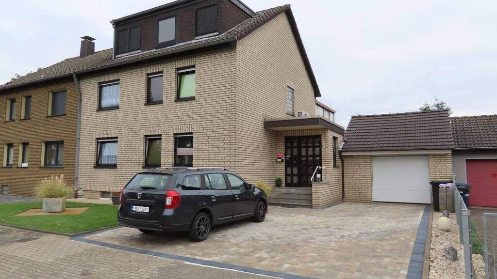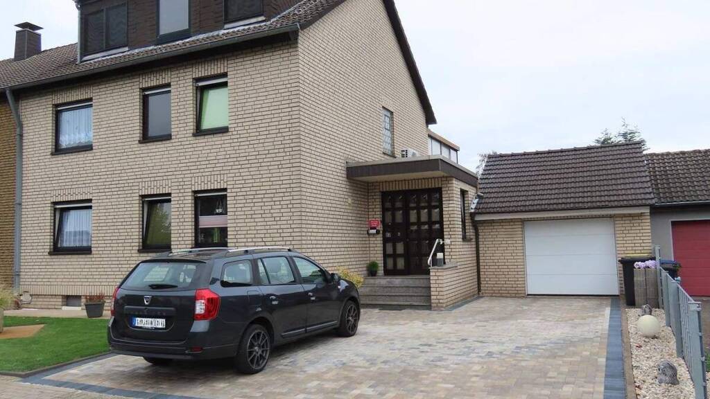 Neben einem äußerst gepflegten Vorgarten schließt sich eine akurat gepflasterte Zugangs- und Einfahrtsfläche an. Vor der Doppelgarage mit elektrischem Fronttor, in der zwei Pkw hintereinander eingeparkt werden können, befindet sich eine Stellfläche für bis zu drei weitere Fahrzeuge.