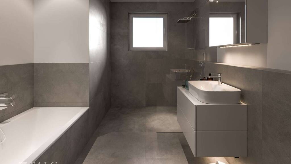 Über die Diele gelangen Sie zum Schlafzimmer, ein individuell nutzbares Zimmer, Gäste WC, sowie Masterbad. Die Bäder sind mit hochwertigen Design-Objekten - ganz im Trend der Zeit - ausgestattet.