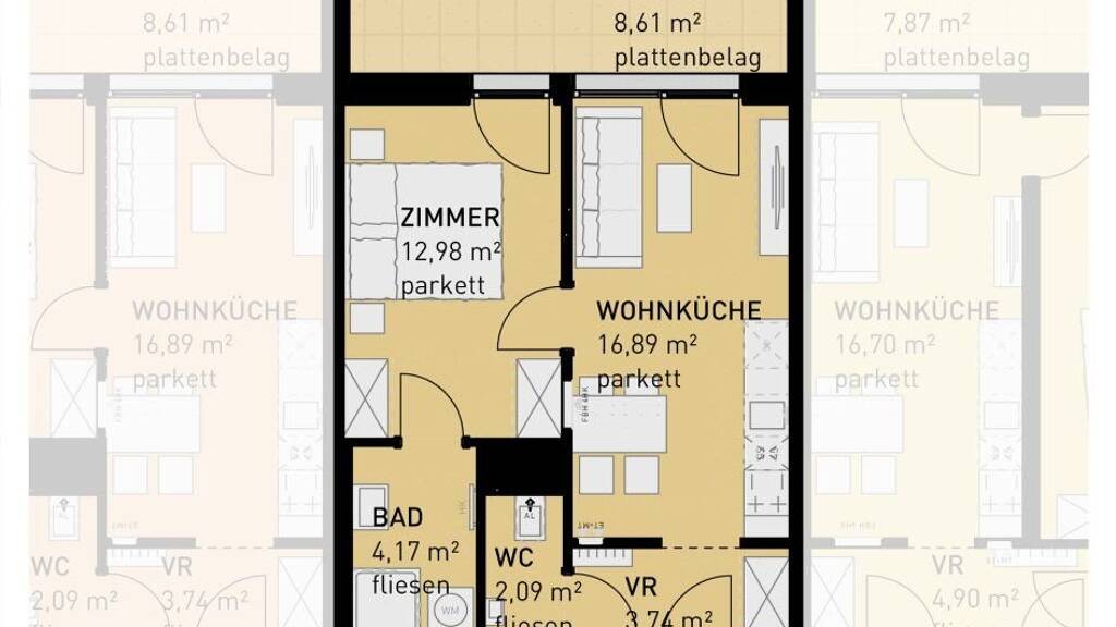 Sollten Sie mehr Platz benötigen, planen wir auch gerne eine größere Wohnung (zB eine 4-Zimmer-Wohnung anstelle von zwei nebeneinander liegenden 2-Zimmer-Wohnungen) für Sie. Fragen Sie einfach bei unserem Vertrieb nach!