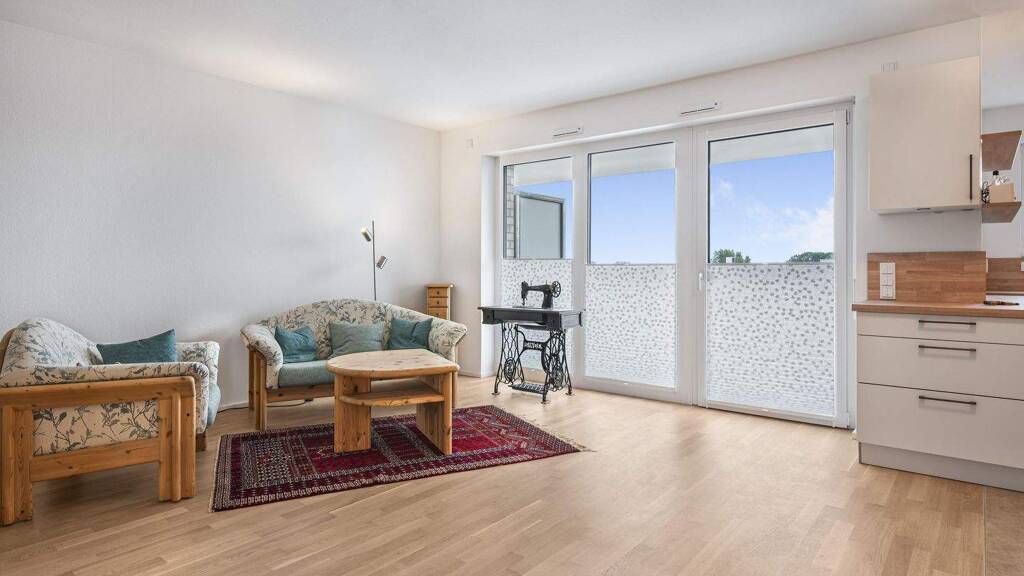 Vom Wohnzimmer aus gelangen Sie auf den großzügigen, überdachten Balkon, der einen herrlichen Blick auf die gepflegte Gartenanlage der Wohnanlage bietet. Ein Ort, an dem Sie entspannte Stunden im Freien genießen können - egal bei welchem Wetter.