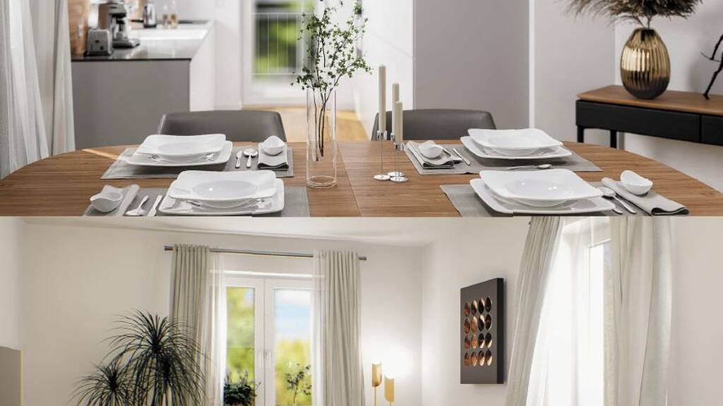 Bitte beachten Sie: Aktuell handelt es sich um eine Planung, die individuell nach Ihren Wünschen angepasst werden kann. Das Haus kann auf nahezu jedem geeigneten Grundstück errichtet werden – ganz nach Ihren persönlichen Vorstellungen und den baurechtlichen Gegebenheiten. Raumaufteilung Im Erdgeschoss erwartet Sie ein großzügiger, offener Wohn- und Essbereich mit moderner Küche – der ideale Mittelpunkt für gemeinsame Stunden. Angrenzend befinden sich eine praktische Speisekammer, ein Gäste-WC mit Dusche sowie ein Hauswirtschaftsraum.