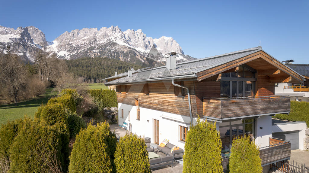 Dieses Chalet liegt in einer ruhigen und sonnigen Lage leicht erhöht über Going und bietet einen Blick auf den Wilden Kaiser sowie auf das Kitzbüheler Horn.
