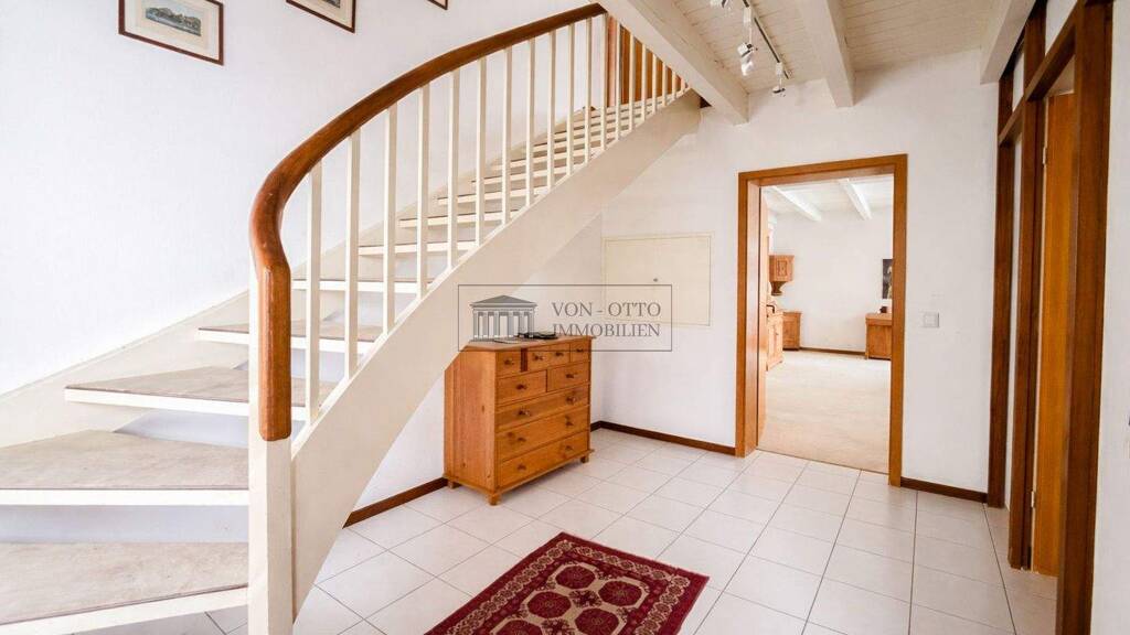 Dieses charmante Einfamilienhaus mit Walmdach bietet großzügige Räume und vielfältige Gestaltungsmöglichkeiten. Die aktuell offene und sehr großzügige Raumaufteilung im Erdgeschoss mit großen Panoramafenstern lässt sich bei Bedarf zugunsten zusätzlicher Zimmer anpassen. Charakteristische Elemente wie sichtbare Balken, eine geweißte Holzdecke sowie große Fenster mit Teakholzrahmen verleihen dem Haus eine besondere Atmosphäre.