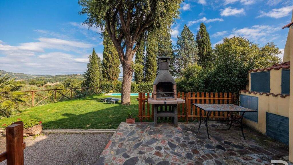 Dieses bezaubernde Anwesen ist Teil eines wunderschönen Rusticos und besticht durch seine authentische Atmosphäre und den unvergleichlichen Blick über die sanften Hügel der Toskana. Über ein privates Tor gelangt man auf das Grundstück, das absolute Privatsphäre garantiert und keinerlei Gemeinschaftsflächen aufweist – ein Ort, an dem man ungestört die Ruhe der Natur genießen kann. Der herrlich angelegte Garten von rund 500 m² lädt mit seiner großen Terrasse und einer überdachten Veranda dazu ein, die toskanische Sonne zu genießen oder laue Sommerabende im Freien zu verbringen. Das Highlight ist zweifellos der private Pool aus Travertinstein (9 x 3 m, 1,3 m tief), der sich harmonisch in die Landschaft einfügt und einen atemberaubenden Ausblick bietet. Im Erdgeschoss befindet sich der gemütliche Wohnbereich mit Bad, der dank großer Fenster lichtdurchflutet ist und direkten Zugang zum Garten bietet – ideal für ein entspanntes Leben im Einklang mit der Natur. Der Schlafbereich erstreckt sich über den ersten Stock und das Dachgeschoss und verfügt über drei Schlafzimmer sowie ein weiteres Badezimmer. Besonders reizvoll ist die große Terrasse aus Terrakottafliesen im ersten Stock, von der aus man den Panoramablick auf den Garten und die umliegende Hügellandschaft genießen kann. Zur modernen Ausstattung gehört eine Photovoltaikanlage mit Speicherbatterien, die für eine nachhaltige Energieversorgung sorgt und das Haus technisch auf den neuesten Stand bringt. Dieses Anwesen verbindet den rustikalen Charme traditioneller toskanischer Bauweise mit modernen Annehmlichkeiten und bietet den idealen Rückzugsort für alle, die Ruhe, Natur und authentisches italienisches Lebensgefühl suchen.