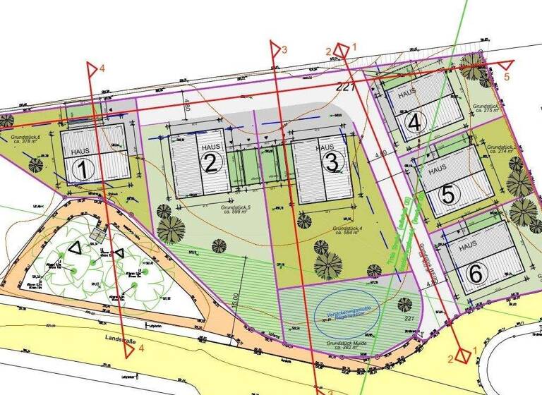 Zusätzlich zur reinen Baufläche von 598 m² erwerben Sie Miteigentumsanteile (anteilig zu 1/6) an den gemeinschaftlichen Flächen. Diese umfassen die private Erschließungsstraße sowie die ökologisch notwendige Versickerungsmulde. Dieser Flächenanteil beträgt 114,17 m².
