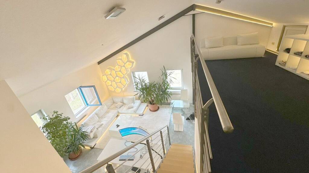 Vom Wohnbereich aus führt eine Treppe hinauf zur Galerieebene. Dieser Bereich stellt ein besonderes Highlight der Wohnung dar und schafft eine sehr gemütliche Atmosphäre. Die Fläche kann individuell genutzt werden - beispielsweise als Arbeitsbereich, Rückzugsort oder zusätzliche Wohnfläche.