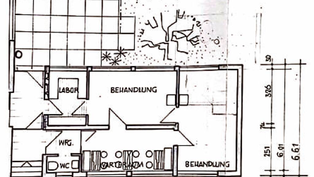 Die Einheit, die zuvor als Zahnarztpraxis diente, wird frisch renoviert übergeben und umfasst einen Eingangs- und Empfangsbereich mit separatem WC, vier flexibel nutzbare Räume sowie einen Aufenthaltsraum mit Zugang zu einer Terrasse.
