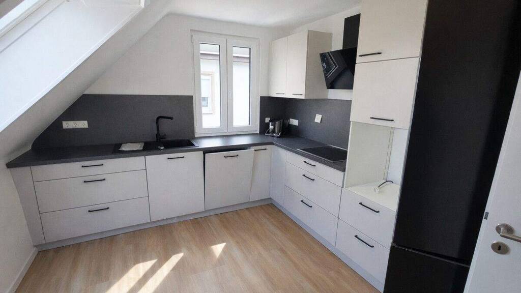 Angekommen in der Dachgeschosswohnung gelangen Sie linkerhand in das Schlafzimmer. Der Raum ist optisch gegliedert durch die Dachschrägen und den zwei vorhandenen Fenster. Im Zimmer weiter kommen Sie in den freundlichen Wohnbereich, welcher das Herzstück der Wohnung bildet. Ebenfalls sind hier an einer Wandseite Dachschrägen vorhanden, die Möblierung aber trotzdem in diversen Varianten vorgenommen werden kann. Zurück über den Flur, welcher zweigeteilt ist, gelangen Sie ins dritte Zimmer das als Kinder- oder Schlafzimmer genutzt werden kann oder aber auch als Büroraum. Stirnseitig des Flures befindet sich das moderne Badezimmer, dieses ist mit grauen Fliesen, einer Handtuchheizung und einer Dusche ausgestattet. Hier der Hinweis, das größere Menschen sich durch die Schräge beeinträchtigt fühlen könnten. In der nebenan befindlichen Küche erwartet Sie eine neue Einbauküche mit sämtlichen gängigen Elektrogeräten und einem separaten Kühl-/Gefrierschrank. Das Dachfenster erhellt hier, wie auch im Bad den Raum mit entsprechenden Tageslicht.