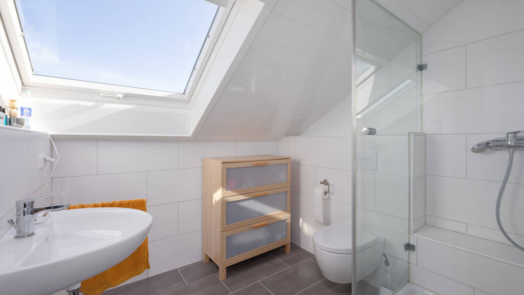 Die Tageslichtbäder sowie das separate WC sind beide in den letzten Jahren saniert und modern und hell gestaltet worden. Das OG ist mit Badewanne, Dusche, WC und 2 Waschbecken ausgestattet, das DG mit Dusche, WC und Waschbecken.