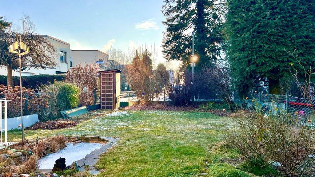Im Erdgeschoss befinden sich ein heller Eingangsbereich mit Garderobe, ein Gäste-WC, eine abgetrennte Küche mit Fenster sowie ein Wohnzimmer mit Zugang zur Terrasse und zum eingezäunten Garten. Dort befindet sich zudem ein kleiner Teich – ideal für Familien.