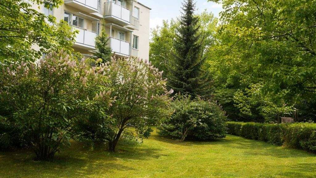 Das Wohnensemble verfügt über gepflegte Außenanlagen mit begrüntem Innenhofcharakter. Fußwege durch die Grünflächen schaffen eine angenehme Distanz zur Straße und erhöhen den Wohnwert für Mieter. Die Außenbereiche sind durch Heckenstrukturen und Baumbestand geschützt und vermitteln ein ruhiges Bestandsgefühl - typisch für die Wohnlagen in Wilhelmstadt.