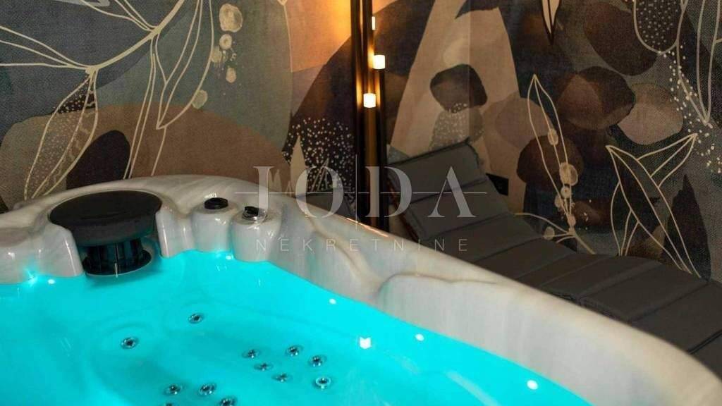 Im Erdgeschoss befindet sich ein Schlafzimmer mit eigenem Bad, ein Wellnessbereich mit Sauna und Whirlpool, ein Abstellraum und ein Badezimmer. Vom Erdgeschoss aus gelangt man auf eine ĂĽberdachte Terrasse, die mit einem groĂźzĂĽgig angelegten Garten von 157 m2 und einem eigenen Swimmingpool verbunden ist.