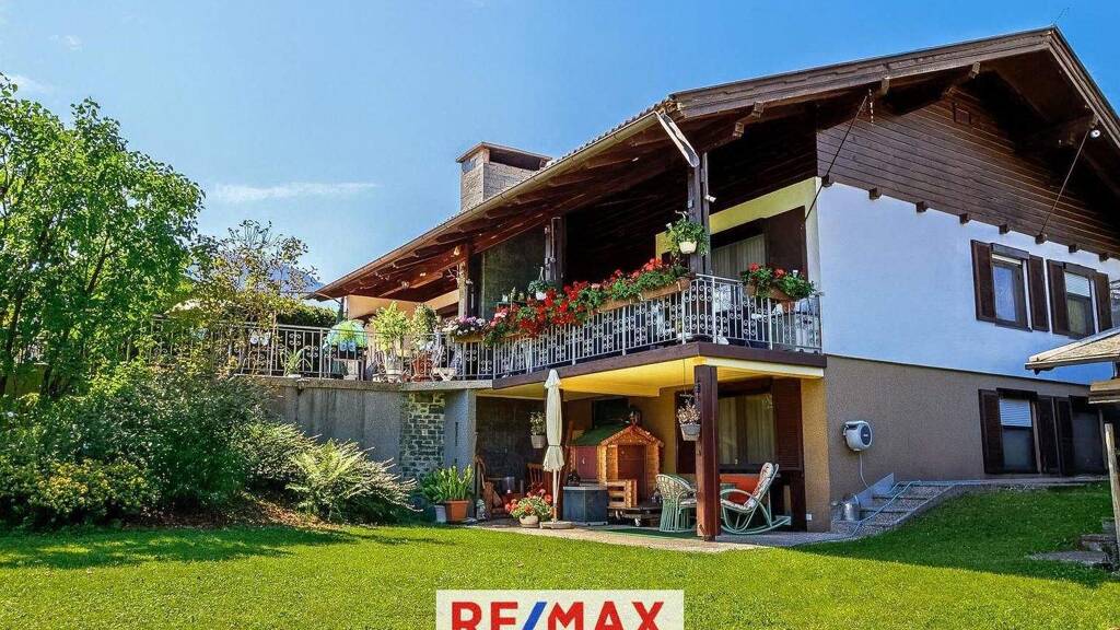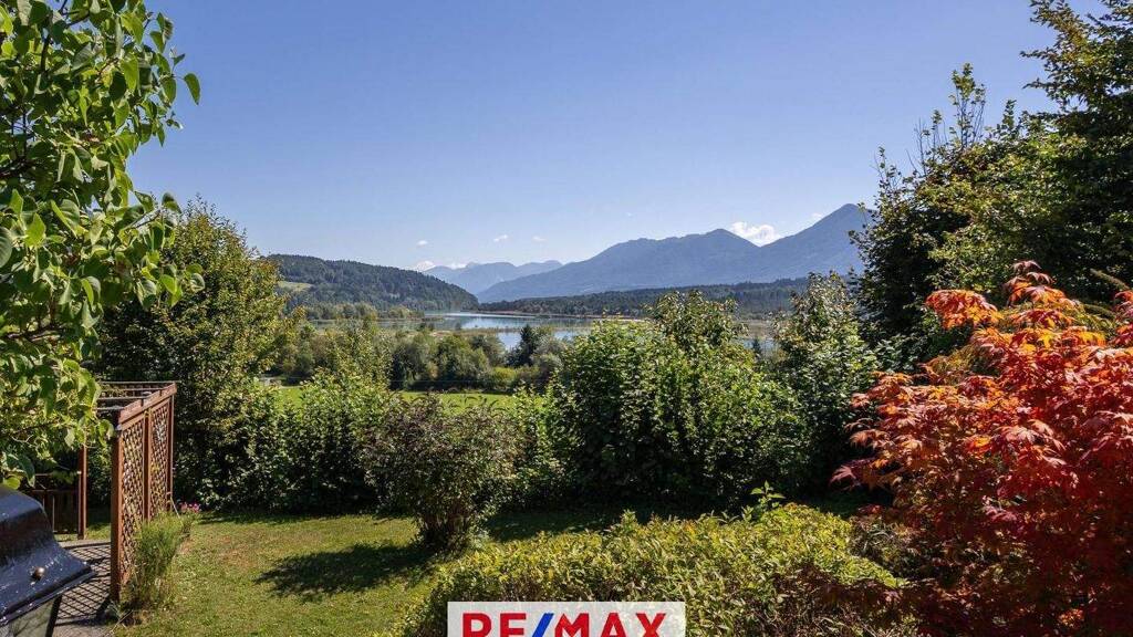 Dieser Bungalow mit rund 2.900 m² Garten bietet viel Platz für Familie, Hobbys und Erholung. Vom Wohnzimmer aus gelangen Sie direkt auf die Terrasse und den Balkon - mit wunderschönem Blick über die Drau.