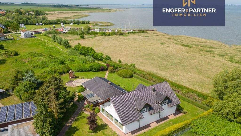 Diese exklusive Villa vereint großzügigen Wohnkomfort, hochwertige Ausstattung und eine einzigartige Lage mit direktem Weitblick auf den Saaler Bodden. Mit einer Wohnfläche von ca. 400 m² auf einem ca. 6.128 m² großen Grundstück bietet das Anwesen ein herausragendes Wohngefühl. Ursprünglich in den 1970er Jahren erbaut, wurde die Immobilie Ende der 1990er Jahre in 1,5-geschossiger Bauweise großzügig erweitert. Das lichtdurchflutete Erdgeschoss des ursprünglichen Gebäudes beeindruckt mit großen Fensterfronten, edlem Fischgrätenparkett im Wohnzimmer und einem traditionellen Kachelofen, der für eine behagliche Atmosphäre sorgt. Hier befinden sich zudem zwei Schlafzimmer, ein Gäste-WC sowie ein Duschbad mit Fenster. Die offene, modern gestaltete Küche verbindet stilvolle Holz- und Hochglanzelemente mit einer großzügigen Kochinsel, die sowohl Gas- als auch Induktionskochfelder bietet - ideal für kulinarische Erlebnisse und gesellige Abende. Der angrenzende Essbereich mit Panoramafenstern und direktem Zugang zur Terrasse eröffnet einen atemberaubenden Blick auf den Saaler Bodden. Der Zugang zur Teilunterkellerung erfolgt ebenfalls über diesen Gebäudeteil. Ein besonderes Highlight des Anbaus ist der luxuriöse Wellnessbereich mit einem großzügigen Indoor-Pool samt Gegenstromanlage, einer Sauna und bodentiefen Fensterfronten, die den Raum mit Tageslicht durchfluten. Ergänzend dazu bietet dieser Bereich einen gemütlichen Sitzbereich mit "Bullerjahn"-Ofen, einen Fitnessbereich sowie Zugang zum großzügigen Hauswirtschafts- und Technikraum. Im Obergeschoss erwartet Sie ein beeindruckendes Dachstudio mit sichtbaren Holzbalken, einem großen Kamin und einer einladenden Lounge-Area - perfekt für entspannte Abende mit spektakulärem Wasserblick. Zudem stehen hier eine weitere Küche, nebst WC und drei großzügige Schlafzimmer zur Verfügung, zwei davon mit einem eigenen Bad en Suite.