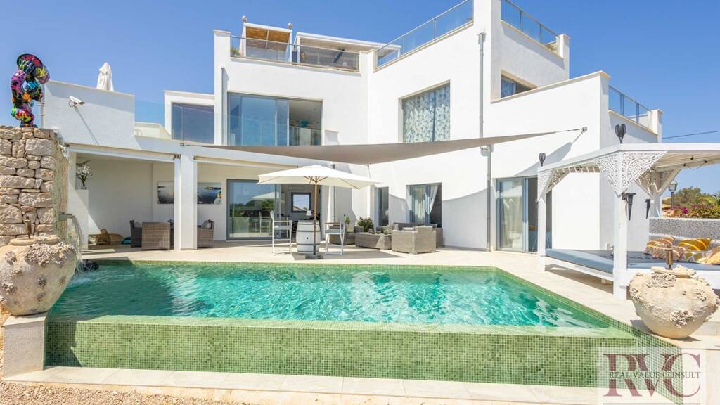 Von Küche und Schlafzimmern gelangen Sie direkt auf die Poolterrasse mit Überlaufpool, Sunbeds und einem stilvollen Loungebereich mit Kamin. Dank der Fußbodenheizung mit Wärmepumpe ist die Villa auch im Winter ein komfortables Zuhause.