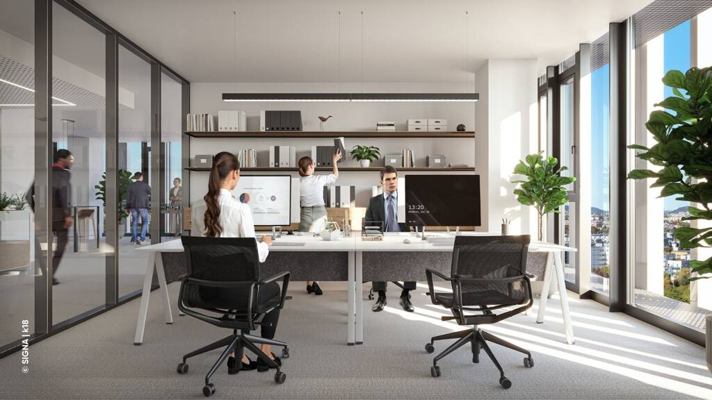 - Separater Foyerbereich mit Portier:in - 4 exklusive Aufzüge für Büronutzer:innen - Öffenbare Fenster - Mechanische Be- und Entlüftung - Ressourcenschonende Heizung & Kühlung (Bauteilaktivierung) - Außenliegender Sonnenschutz - Raumhohe Verglasung - Raumhöhe 3,00 - 3,25 m - Energiesparende Bürobeleuchtung - Downlights in Gangzonen - Doppelboden inkl. Bodentanks - Hochwertige Teppichfliesen - Auf Wunsch Parkett bzw. Vinylboden - Videoüberwachungsanlage in Allgemeinbereichen - Moderne Zutritts- und Sicherheitssysteme - Tiefgarage mit E-Ladestationen - Zutrittsgesicherter Fahrradraum mit E-Ladestationen - Freifläche in jedem Geschoß