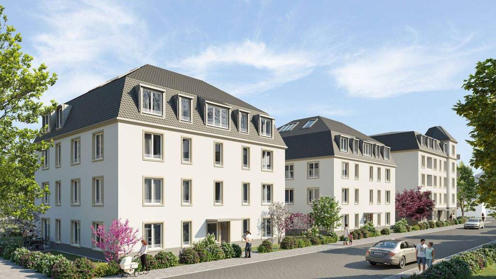 Haus C umfasst vier Vollgeschosse. Die Fassadengestaltung folgt einer klaren, zeitlosen und traditionellen Formensprache, die sich harmonisch in die bestehende Bebauung der Umgebung einfügt. Großzügige Fensterflächen sorgen für helle Wohnräume, während Balkone und Terrassen attraktive Außenbereiche mit angenehmen Ausblicken bieten.