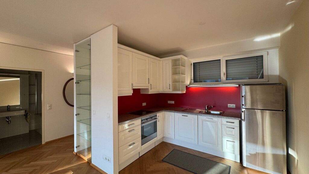 Das Highlight der Wohnung ist das lichtdurchflutete Wohnzimmer mit seine großen Fensterflächen und viel Platz für eine gemütliche Couch, eine Fernsehwand und einen Essbereich. Die gepflegte Küche ist mit sämtlichen E-Geräten ausgestattet und lädt für ein vergnügliches Kocherlebnis ein.