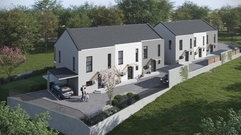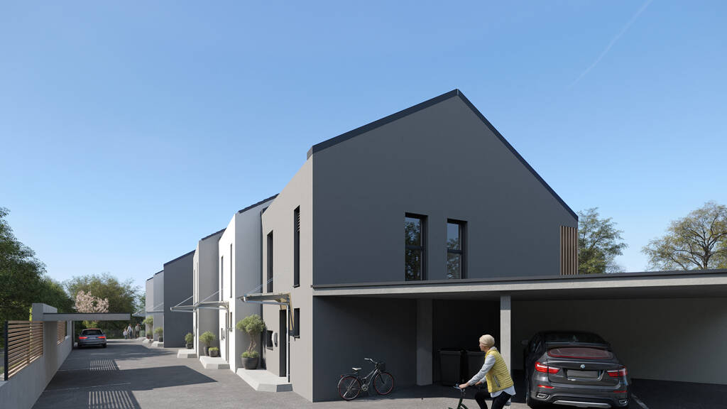 Die sechs Reihenhäuser zeichnen sich durch ihre großzügigen Raumaufteilungen aus. Sie erstrecken sich über zwei Etagen und bieten sowohl Paaren als auch Familien den idealen Lebensraum. Im Erdgeschoss finden Sie einen Abstellraum, der sich ideal für die Lagerung von Haushaltsgegenständen eignet. Der lichtdurchflutete Wohn- und Essbereich bildet das Herzstück Ihres neuen Zuhauses mit direktem Zugang zur Terrasse und zum Garten, der Ihnen einen Ort der Entspannung im Freien bietet. Ein Gäste-WC rundet das Raumangebot im Erdgeschoss ab. Das Obergeschoss bietet ein großzügiges Badezimmer und drei Schlafzimmer, die eine perfekte Rückzugsmöglichkeit für alle Bewohner schaffen. Für Fahrzeuge stehen fünf Carportstellplätze, sechs freie Abstellplätze sowie Besucherparkplätze zur Verfügung.