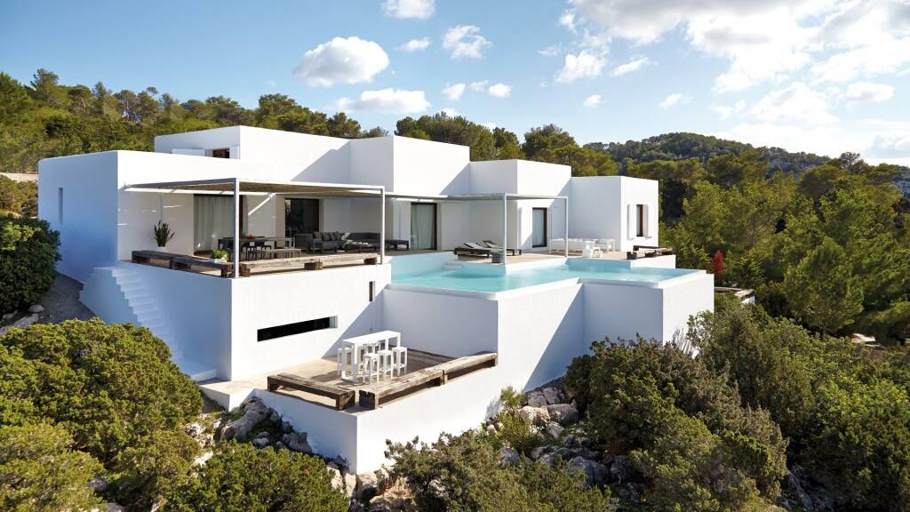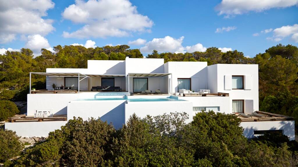 Gro?z?gige Terrassen, ein Infinity-Pool und offene Wohnbereiche bieten einen atemberaubenden Blick auf die Landschaft Ibizas, wobei jedes Zimmer so positioniert ist, dass man unvergessliche Sonnenunterg?nge genie?en kann.