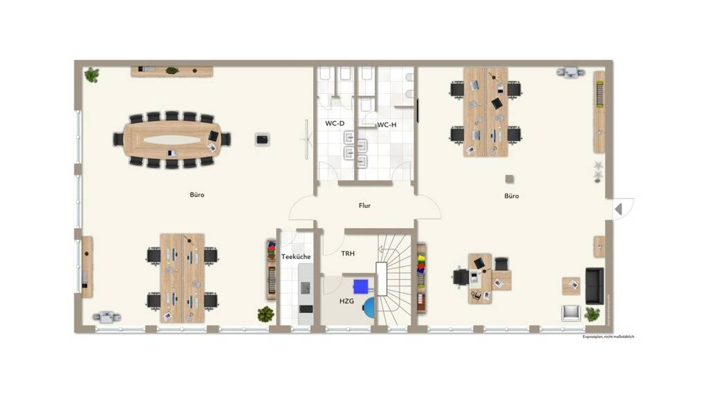 Die ca. 480 m² Bürofläche verteilen sich auf zwei Etagen und sind über ein gemeinschaftliches Treppenhaus zu erreichen. Die Büroetagen verfügen über eine ähnliche Aufteilung und bieten jeweils getrennte Sanitäranlagen für Damen und Herren, eine Pantryküche je Etage und mehrere großzügige Gruppenbüroräume. Durch das zentrale Treppenhaus und die Abschließbarkeit der jeweiligen Etagen, wäre auch eine Anmietung von einer Etage möglich.