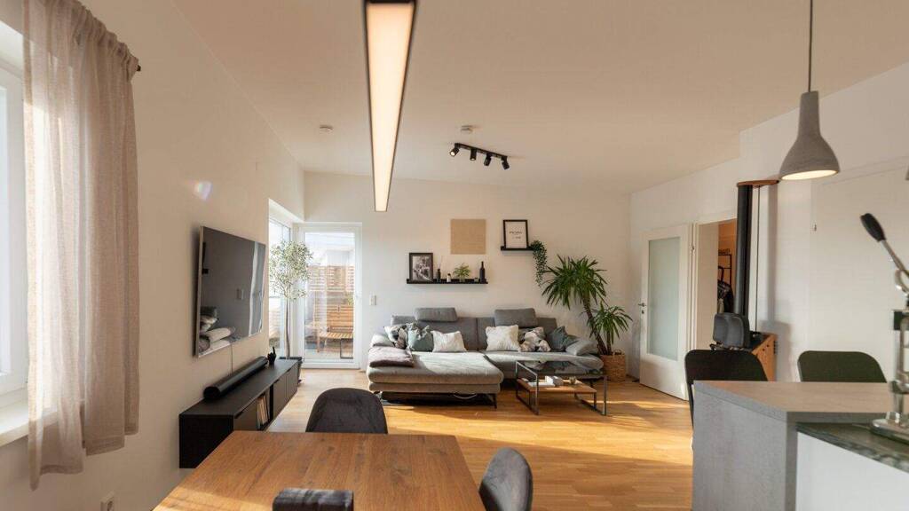 Die 2021 fertiggestellte Wohnung befindet sich im letzten Liftstock eines modernen Wohnhauses und bietet ca. 75,27?m² Wohnfläche sowie eine gemütliche Loggia (2,5?m²) und eine großzügige Terrasse mit 11,69?m², ideal für Sonnenstunden von morgens bis abends.