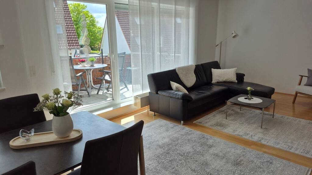 Der gesamte Wohnbereich ist mit einem Parkett in Ahornoptik ausgestattet. KĂĽche und Badezimmer sind gefliest.