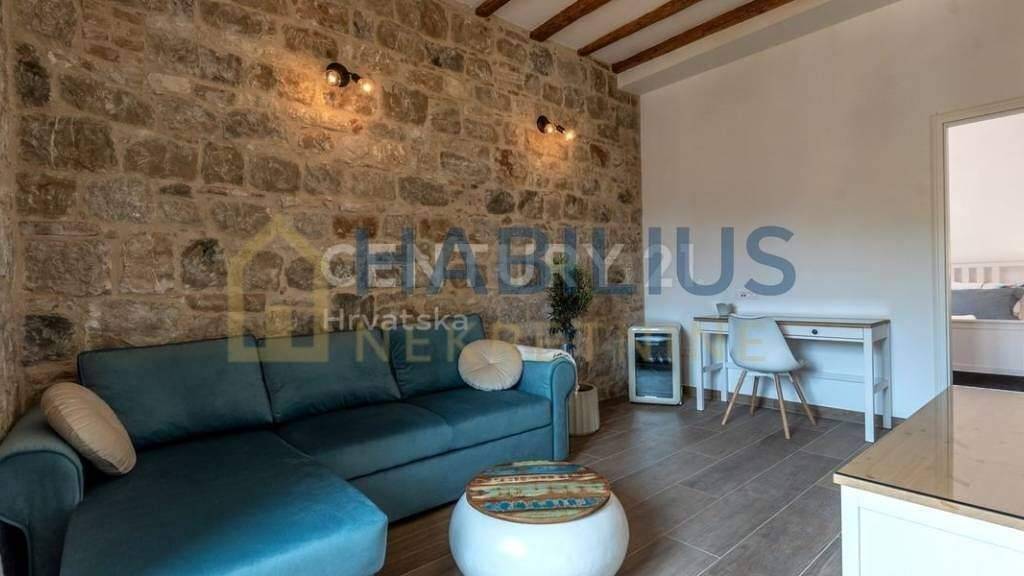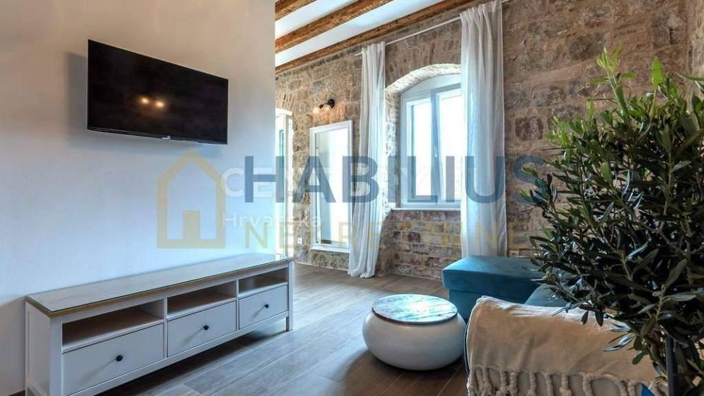 Posredujemo pri najmu novoadaptiranog Deluxe stana u centru grada kod kazalista. Nalazi se na drugom katu stare kamene kuce visokih plafona te je cijeli orijentiran na jugu, tako da je pun svjetla sa prekrasnim otvorenim pogledom na grad. Sastoji se od hodnika, velikog dnevnog boravka, kuhinje, spavace sobe, balkona i kupatila. TV i AC su u svakoj prostoriji sa brzim internetom. Stan je ureden dizajnerski. Iznajmljije se od 01.10.2024 do iduce sezone - po dogovoru.