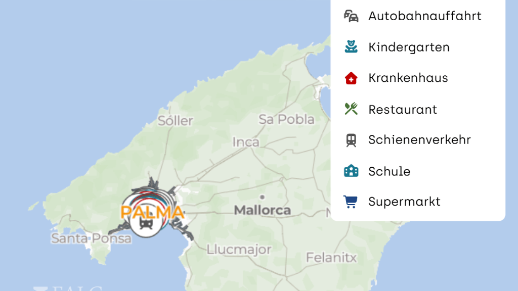 Mobilität und Anbindung Die nächste Bushaltestelle Passeig Mallorca es Baluard ist fußläufig erreichbar und bietet eine unkomplizierte Anbindung in verschiedene Stadtteile. Mit dem Auto gelangen Sie in wenigen Minuten zur nächsten Autobahnauffahrt, wodurch auch Ziele außerhalb Palmas schnell erreichbar sind. Der Flughafen Palma de Mallorca ist je nach Verkehr in etwa 15 bis 20 Minuten mit dem Auto erreichbar.