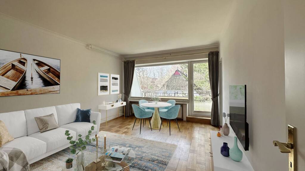 Die Wohnung verfügt über eine Wohnfläche von ca. 39 m² und überzeugt durch eine durchdachte Aufteilung. Das Wohnzimmer bildet den zentralen Mittelpunkt der Wohnung und bietet direkten Zugang zum großzügigen Balkon mit Südwest-Ausrichtung und elektrischer Markise, der sich über die gesamte Breite der Wohnung erstreckt und angenehme Sonnenstunden ermöglicht.
