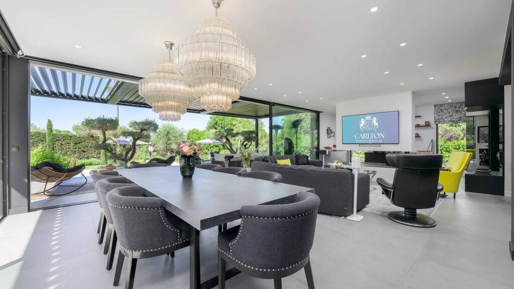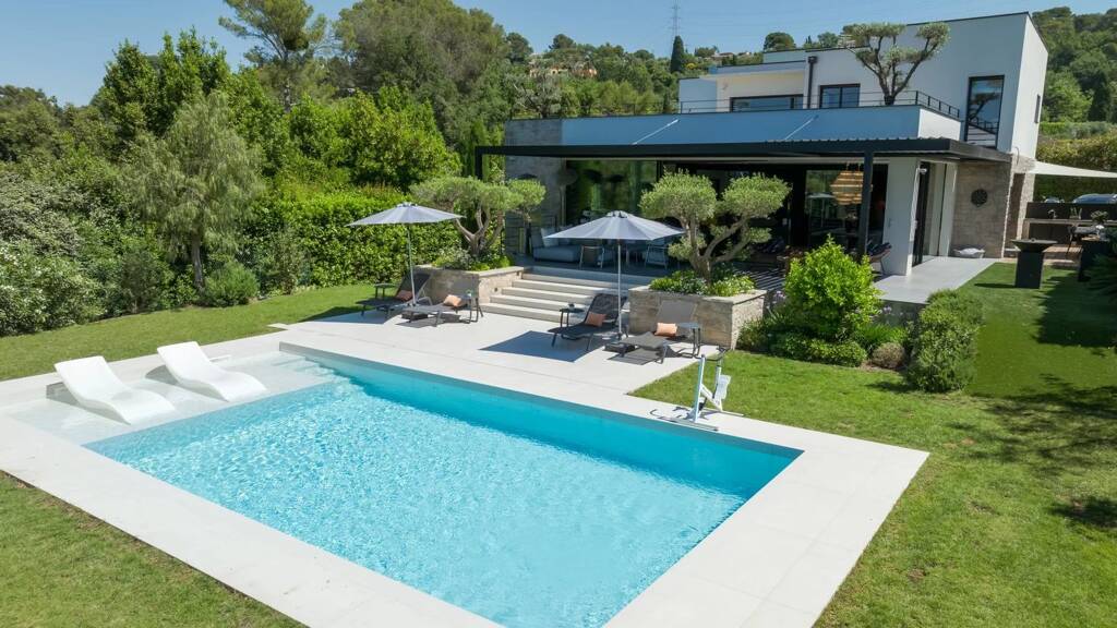 In the heart of a sought-after residential area of Mougins, within a secure and gated estate, discover this stunning contemporary villa, entirely renovated by an interior architect. Nestled in a peaceful, green environment, this exceptional property enjoys an ideal South-West exposure and complete privacy, with no overlooking neighbors.