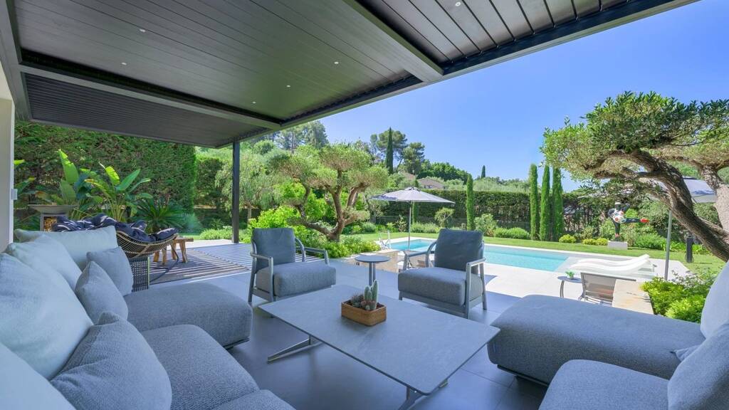 The amenities reflect the quality of this outstanding property: a fully integrated home automation system allows for effortless control of the villa's main features. A stunning custom-designed glass wine cellar, discreetly positioned between the kitchen and the living room, adds a touch of elegance to the main living space. Outdoors, an elegant bioclimatic pergola naturally extends the living areas, providing an adjustable shaded space throughout the seasons. The beautifully maintained garden features a heated and cooled saltwater swimming pool, a pétanque court, and a genuine jacuzzi on the terrace, offering open views of the old village of Mougins.